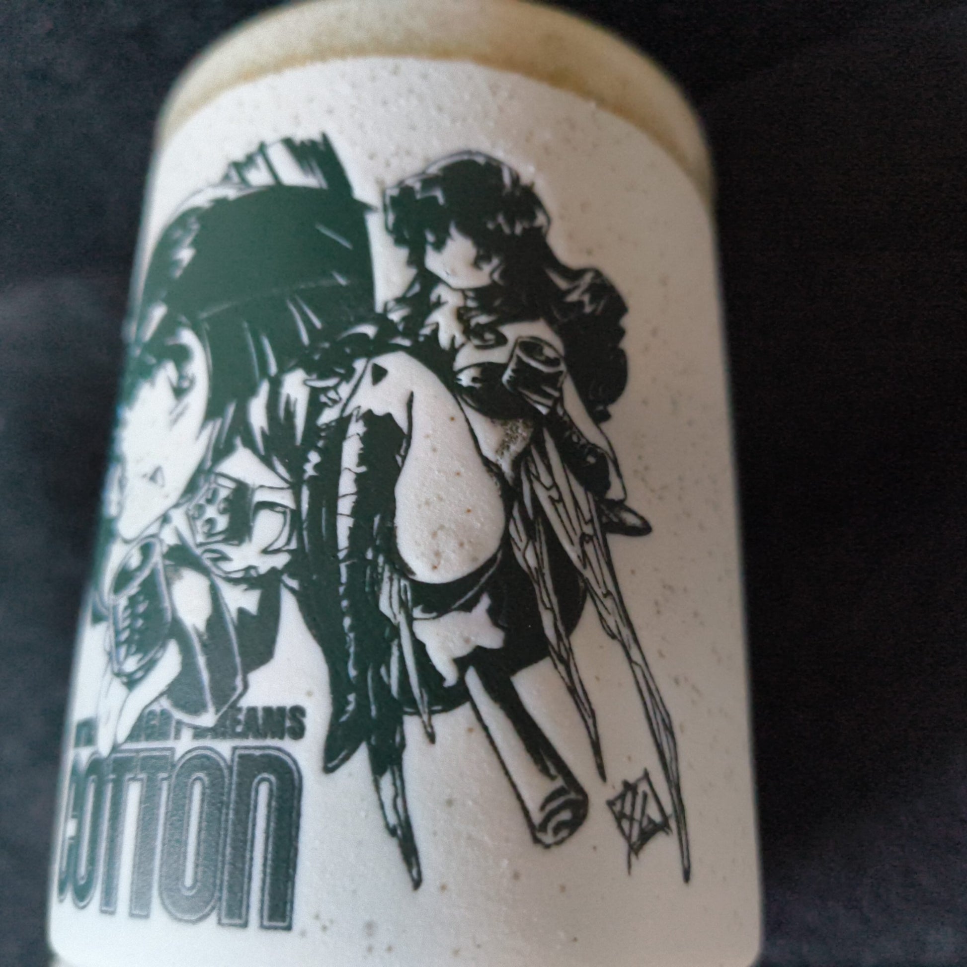 The cup has a unique textured surface and a green print of the character Nata de Cotton and Silk.